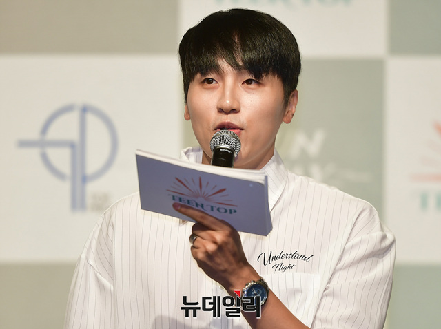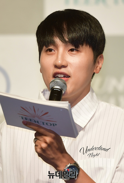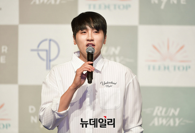 개그맨 류근지가 4일 오후 서울 강남구 일지아트홀에서 열린 아이돌그룹 '틴탑(TEENTOP)'이 앨범 'DEAR.N9NE(디어나인)' 쇼케이스에서 앨범을 소개하고 있다. 트로피컬 하우스와 뭄바톤을 결합해 청춘의 일탈을 담은 타이틀곡 'RUN AWAY(런 어웨이)'을 포함해 6곡을 담았다.