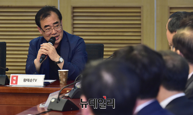 정치 평론가 황태순이 5일 오전 국회 의원회관에서 '행동하는 자유시민' 주최로 열린 '자유로운 TALK - 문(MOON)제적 언론탄압' 토론회에서 인사말을 하고 있다.
