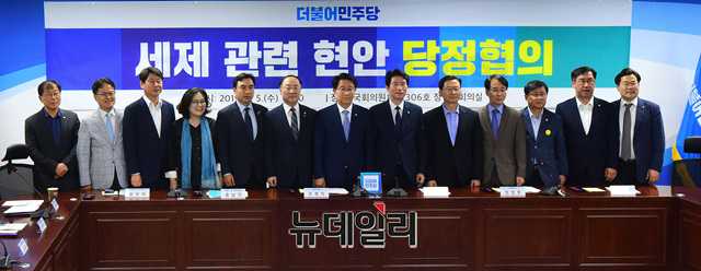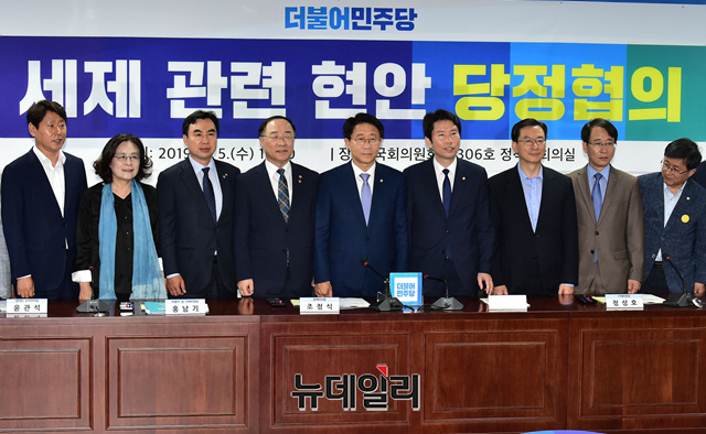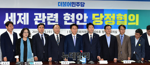 이인영 더불어민주당 원내대표, 조정식 정책위의장, 홍남기 경제부총리 겸 기획재정부 장관 등 참석자들이 5일 오전 국회 의원회관에서 열린 세제 관련 현안 당정협의에 앞서 기념촬영을 하고 있다.