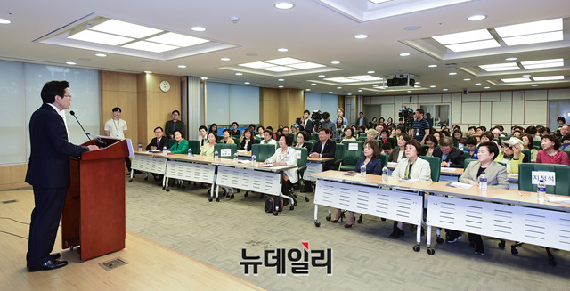 황교안 자유한국당 대표가 5일 오전 국회 의원회관에서 송희경 의원과 한국여성단체협의회 주최로 열린 '국회와 함께하는 여성가족포럼'에서 축사를 하고 있다.