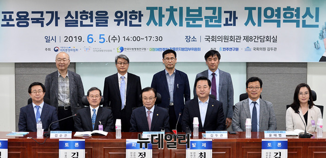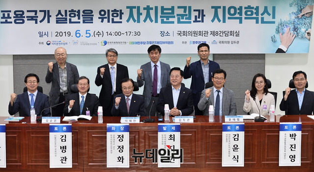 이해찬 더불어민주당 대표, 김두관 의원 및 참석자들이 5일 오후 국회 의원회관에서 열린 '포용국가 실현을 위한 자치분권과 지역혁신' 토론회에서 기념촬영을 하고 있다.