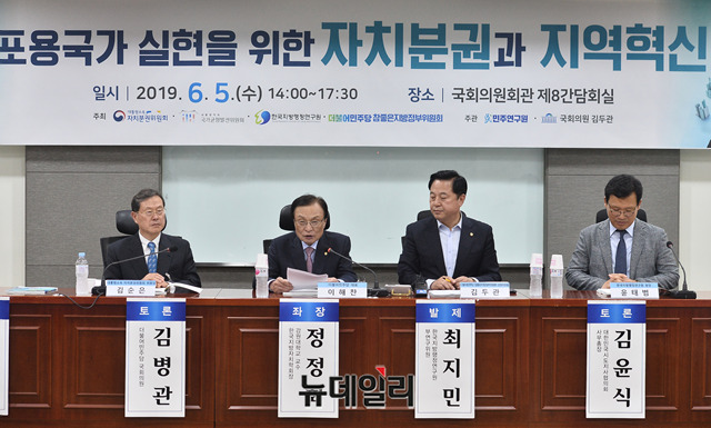 이해찬 더불어민주당 대표가 5일 오후 국회 의원회관에서 열린 '포용국가 실현을 위한 자치분권과 지역혁신' 토론회에서 축사를 하고 있다.