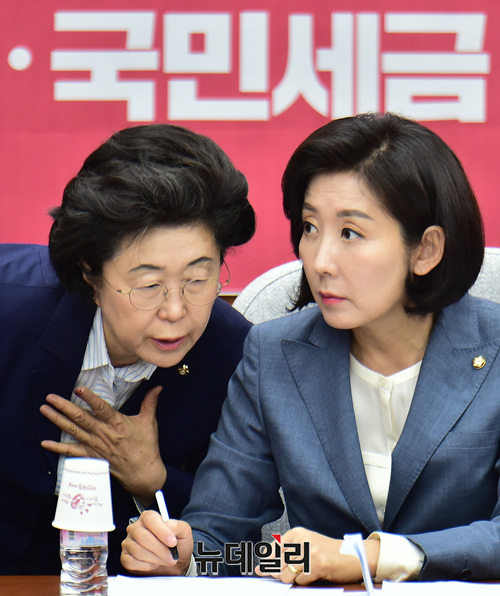 나경원 자유한국당 원내대표가 7일 오전 국회에서 열린 원내대책회의에 참석해 의은재 의원과 대화를 나누고 있다.