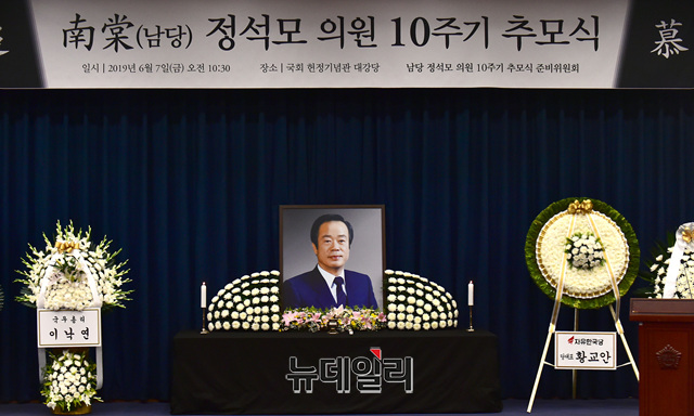 '남당 정석모 의원 10주기 추모식'이 7일 오전 국회 헌정기념관에서 열리고 있다. 故 정석모 의원은 정진석 자유한국당 의원의 부친으로 제18대 강원도지사, 제15대·제18대 충청남도지사, 6선(10대~15대) 국회의원을 지냈다.