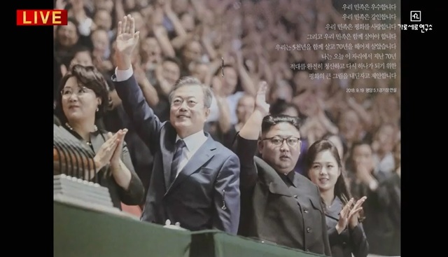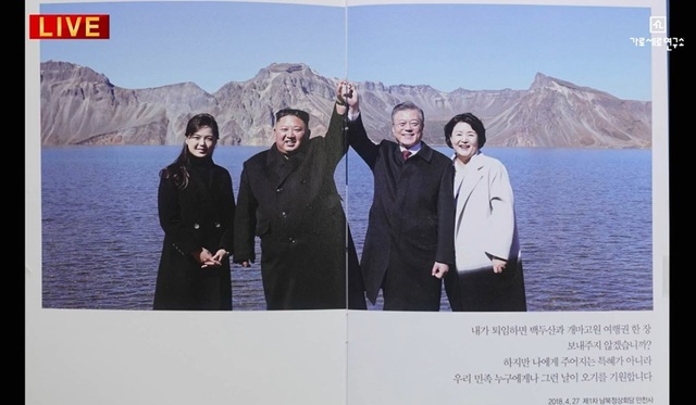 김 전 기자는 "이 브로슈어를 보면 5페이지 중 2페이지에 북한 김정은의 얼굴이 나온다"며 "문재인 대통령 부부와 김정은 부부가 나란히 찍은 두 장의 기념사진이 오찬 메뉴와 함께 나온 브로슈어에 담겨 있었다"고 말했다.