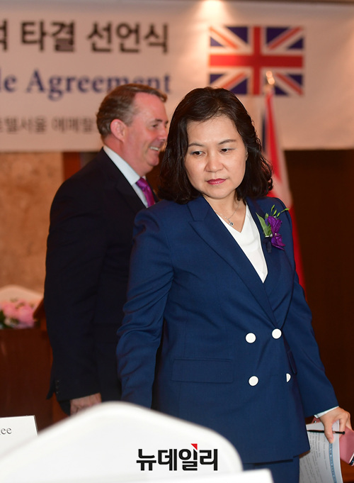 유명희 산업통상자원부 통상교섭본부장과 '리암 폭스(Liam Fox)' 영국 국제통상부 장관이 10일 오전 서울 중구 롯데호텔 본점에서 '한-영 자유무역협정(FTA) 원칙적 타결 선언식'에 입장하고 있다.