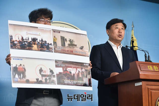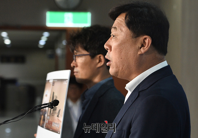 김종훈 민중당 의원이 10일 오전 국회 정론관에서 현대중공업 주주총회 위법성과 사측폭력 및 불법행위 수사를 촉구하는 기자회견을 갖고 있다.
