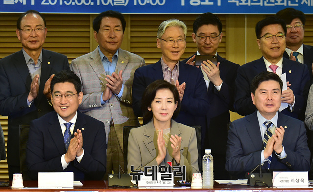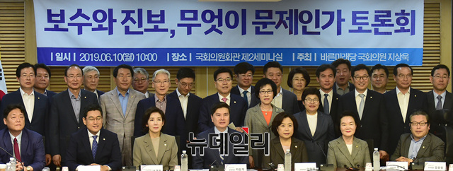 나경원 자유한국당 원내대표와 오신환 바른미래당 원내대표, 지상욱 의원 등 여야 국회의원들이 10일 오전 국회 의원회관에서 열린 '보수와 진보 무엇이 문제인가?' 토론회에 참석해 기념사진을 촬영하고 있다.