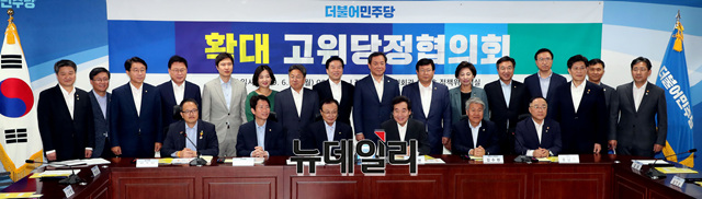 이해찬 더불어민주당 대표, 이인영 원내대표, 이낙연 국무총리, 홍남기 경제부총리 겸 기획재정부 장관, 김수현 청와대 정책실장 등 당정청 주요 인사들이 10일 오전 국회 의원회관에서 열린 확대 고위당정협의회에 참석해 기념촬영을 하고 있다.