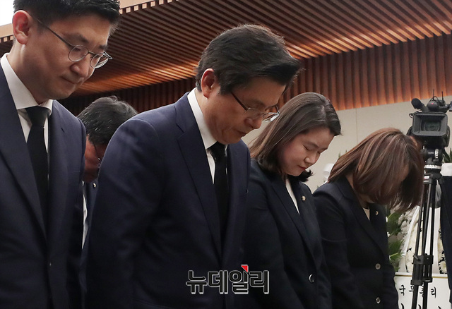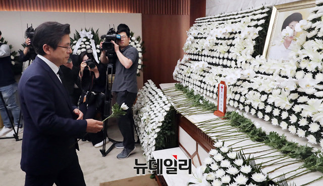 황교안 자유한국당 대표가 11일 서울 서대문구 신촌 세브란스 병원 장례식장에 마련된 故 이희호 여사 빈소를 찾아 조문하고 있다.