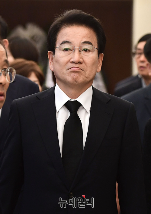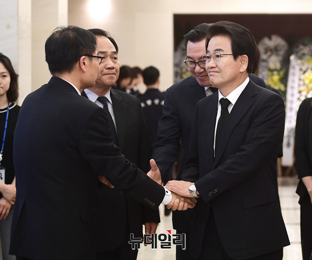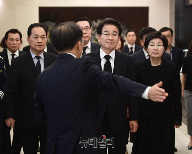 정동영 민주평화당 대표가 11일 서울 서대문구 신촌 세브란스 병원 장례식장에 마련된 故 이희호 여사 빈소를 찾아 조문하고 관계자들과 인사를 나누고 있다.