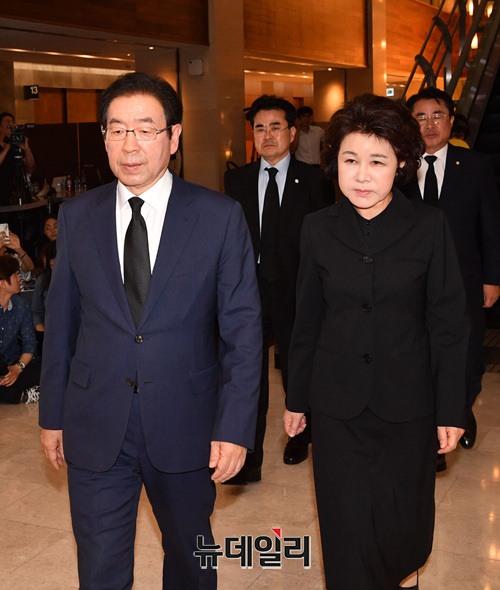 박원순 서울시장과 부인 강난희 씨가 11일 오후 서울 서대문구 신촌 세브란스병원 장례식장에 마련된 고 이희호 여사의 빈소에서 조문을 하고 있다.
