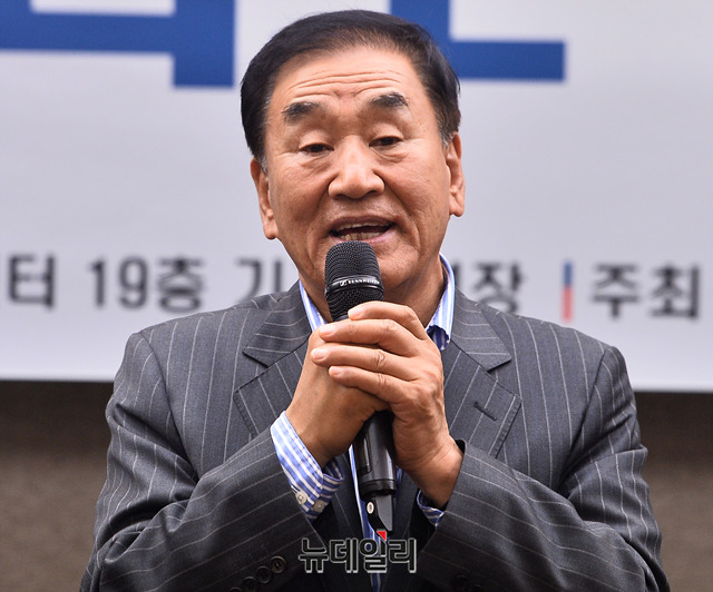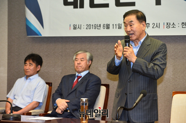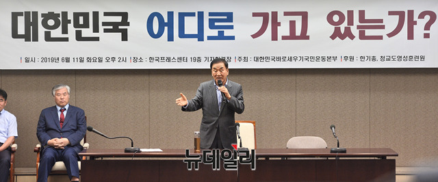 이재오 4대강보해체저지범국민연합 공동대표가 11일 오후 서울 중구 한국프레스센터에서 열린 '대한민국 어디로 가고 있는가' 기자회견에서 발언을 하고 있다. 이날 이 대표는 "4대강 보 해체는 국가를 해체하는 것"이라고 주장했다.