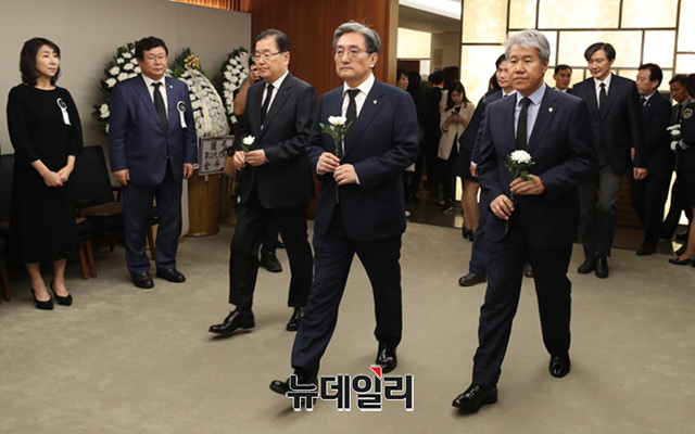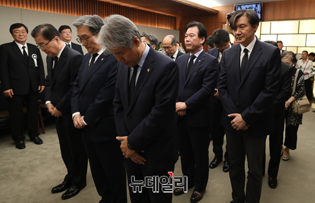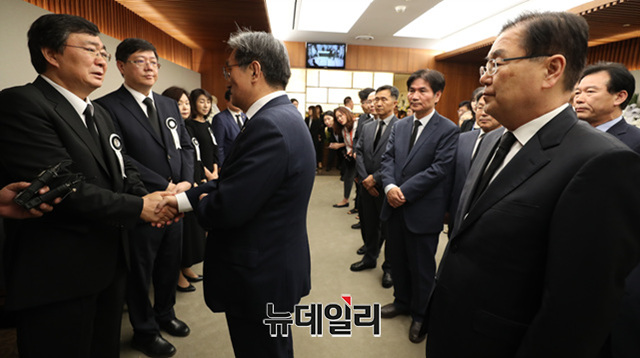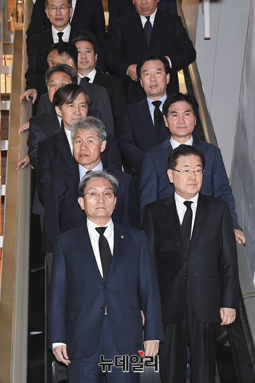 노영민 대통령비서실장, 조국 민정수석비서관 등 청와대 주요 인사 12명이 11일 오후 서울 서대문구 신촌 세브란스병원 장례식장에 마련된 고 이희호 여사의 빈소를 조문 하고 있다.