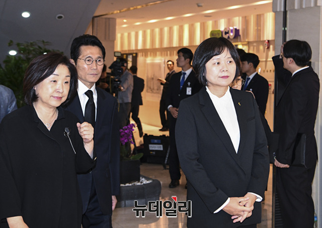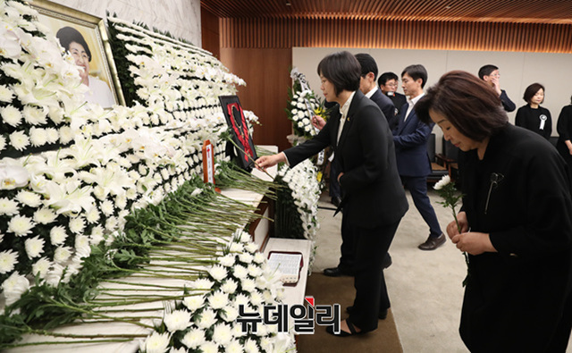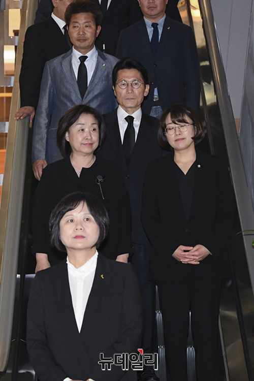 정의당 이정미 대표, 윤소하 원내대표, 심상정 의원이 11일 오후 서울 서대문구 신촌 세브란스병원 장례식장에 마련된 고 이희호 여사의 빈소를 조문 하기 위해 입장하고 있다.