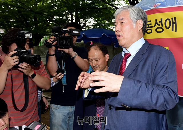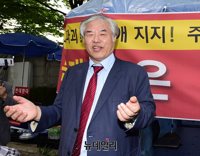 전광훈 한국기독교총연합회 대표회장이 11일 오후 서울 종로구 청와대 앞 분수대광장에서 릴레이 단식기도를 앞두고 취재진의 질문에 답하고 있다.