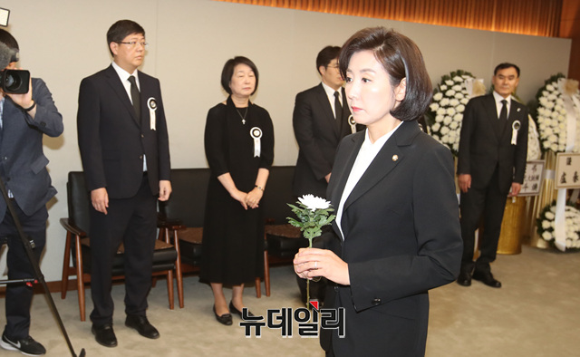 나경원 자유한국당 원내대표가 11일 서울 서대문구 신촌세브란스병원 장례식장에 마련된 고 이희호 여사 빈소를 찾아 조문하고 있다.