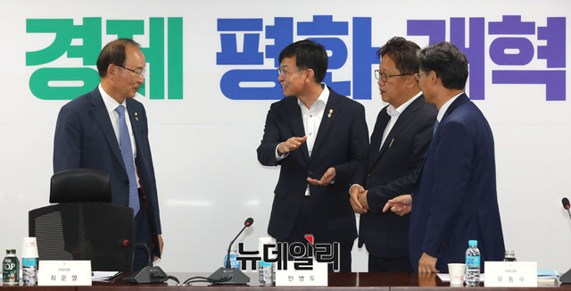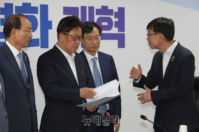 김상조 공정거래위원장이 12일 오후 국회 의원회관에서 열린 정무위원회 당정협의회에 참석해 민병부 정무위원장 등 더불어민주당 정무위 소속 의원들과 대화를 나누고 있다.