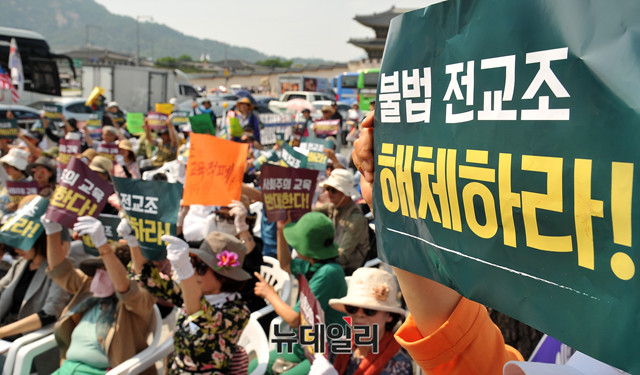 전국학부모연합이 12일 오후 서울 종로구 광화문 시민열린마당에서 '전교조 합법화 반대집회'를 열고, 전교조를 규탄하는 구호를 외치고 있다.