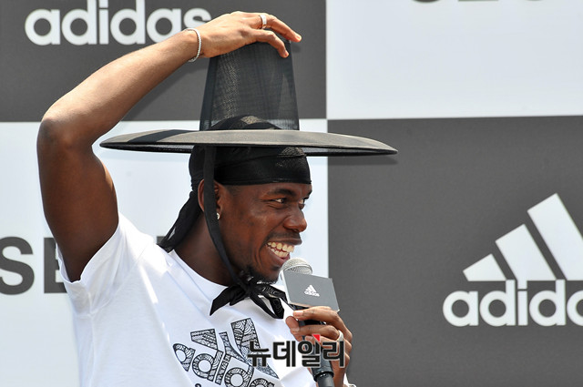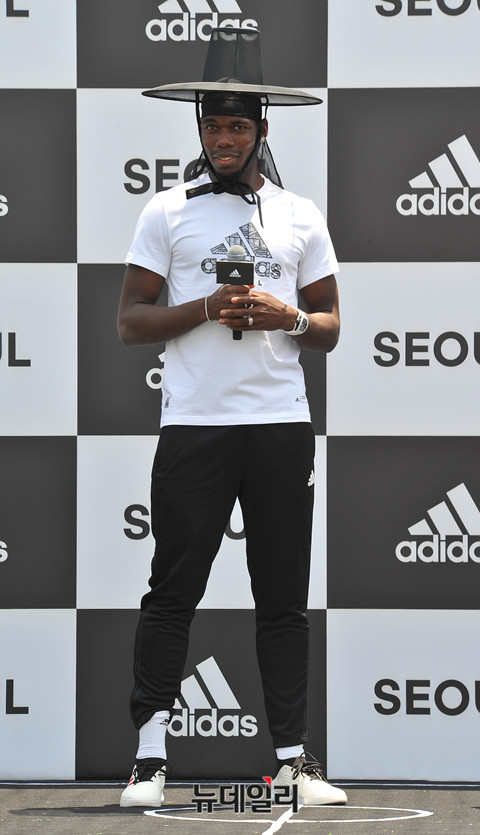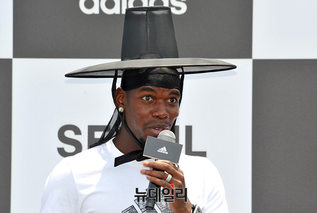 잉글랜드 프리미어리그 맨체스터 유나이티드의 폴 포그바가 13일 오후 서울 용산구 아이파크몰 풋살 경기장에서 열린 '아디다스-폴 포그바 아시아 투어' 행사에 참석해 갓을 선물 받고 놀란 표정을 짓고 있다.