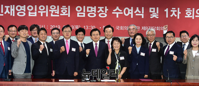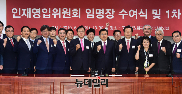 황교안 자유한국당 대표가 13일 오후 국회 의원회관에서 열린 인재영입위원회 임명장 수여식에서 위원들과 기념사진을 촬영하고 있다.