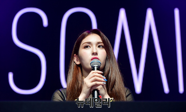 가수 전소미가 13일 오후 서울 마포구 신한판스퀘어에서 열린 솔로 데뷔 쇼케이스에서 데뷔 소감을 밝히고 있다.