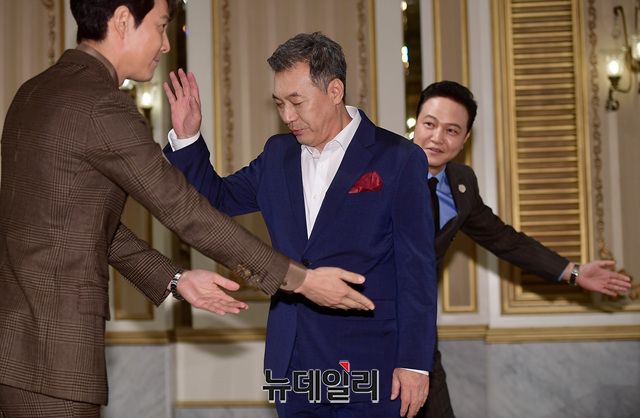 배우 김갑수가 13일 오후 서울 강남구 임피리얼팰리스 호텔에서 열린 금토드라마 '보좌관(극본 이대일, 연출 곽정환)' 제작보고회에서 이정재와 정웅인의 안내를 받으며 입장하고 있다.