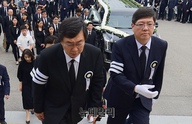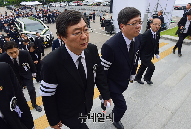 김대중 전 대통령의 부인 고 이희호 여사의 추모식이 14일 오전 서울 동작구 국립서울현충원 현충관에서 열린 가운데 고인의 아들 김홍업 전 의원과 김홍걸 민족화해협력범국민협의회 대표상임의장이 식에 참석하기 위해 입장하고 있다.