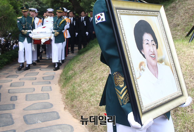 김대중 전 대통령의 부인 고 이희호 여사의 안장식이 14일 오전 서울시 동작구 국립서울현충원에서 열린 가운데 운구행렬이 묘역으로 들어서고 있다.