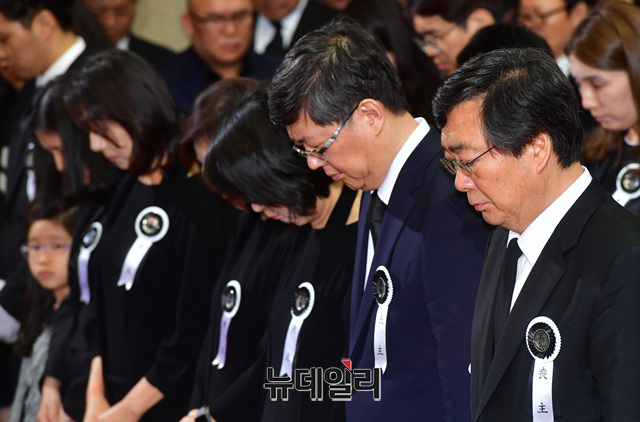 고 이희호 여사의 사회장 추모식 14일 오전 서울 동작구 국립현충원 내 현충관에서 엄수되는 가운데 차남 김홍업 전 의원과 삼남 김홍걸 민화협 대표상임의장을 비롯한 유가족이 헌화하고 있다