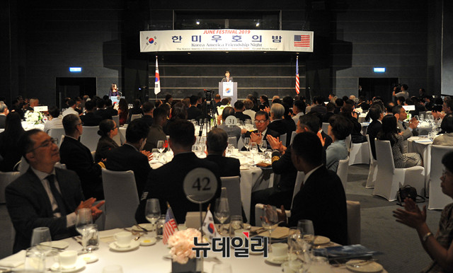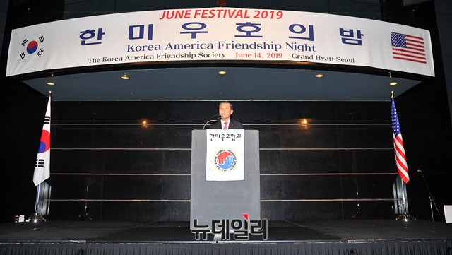 황진하 한미우호협회 회장이 14일 오후 서울 용산구 하얏트호텔 그랜드볼룸에서 열린 협회 창설 제28주년 기념 '한미우호의 밤(Korea America Friendship Night)' 행사에 참석해 인사말을 하고 있다.