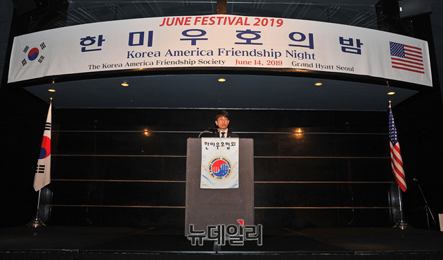 박재민 국방부 차관이 14일 오후 서울 용산구 하얏트호텔 그랜드볼룸에서 열린 협회 창설 제28주년 기념 '한미우호의 밤(Korea America Friendship Night)' 행사에 참석해 축사를 하고 있다.