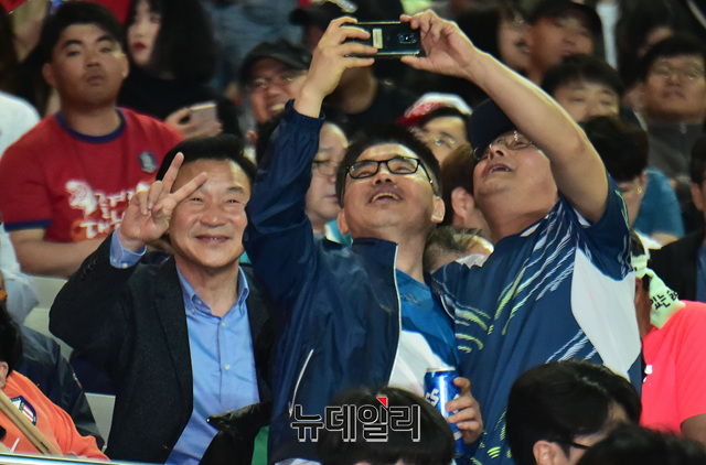 2019 FIFA U-20 월드컵 '대한민국 대 우크라이나' 결승전이 열린 16일 오전 서울 마포구 서울 월드컵 경기장에서 손학규 바른미래당 대표가 거리응원에 나선 시민들과 사진을 찍고 있다.