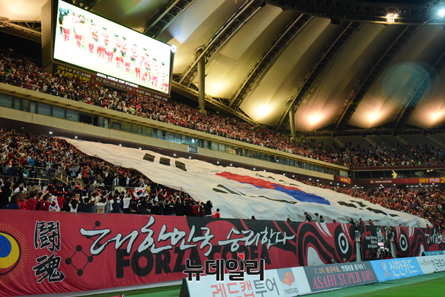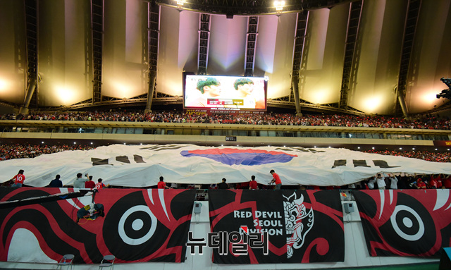 [포토] 서울 월드컵 경기장에 펼쳐진 대형 태극기