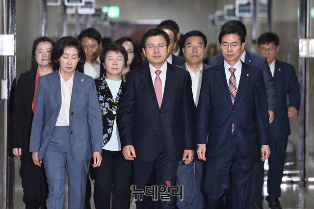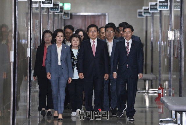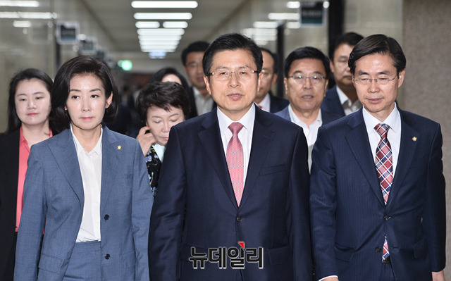 황교안 자유한국당 대표, 나경원 원내대표 및 한국당 지도부가 17일 오전 국회에서 열린 최고위원회의에 입장하고 있다.