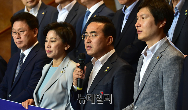 더불어민주당 을지로위원회 박홍근 위원장이 17일 오전 국회 로텐더홀 계단에서 '민생입법 통과 및 국회정상화 촉구 행동' 기자회견에서 발언을 하고 있다.