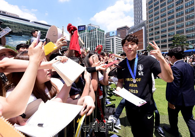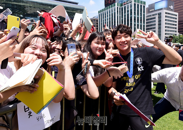 월드컵 준우승을 차지한 U-20 국가대표팀 이광연 선수가 17일 오후 서울 중구 서울시청 앞 서울광장에서 열린 환영 행사 직후 팬들과 사진 촬영을 하고 있다.