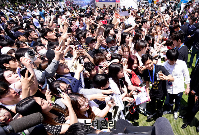 월드컵 준우승을 차지한 U-20 국가대표팀 이강인 선수가 17일 오후 서울 중구 서울시청 앞 서울광장에서 열린 환영 행사 직후 팬들과 사진 촬영을 하고 있다.