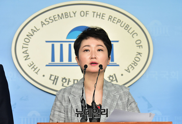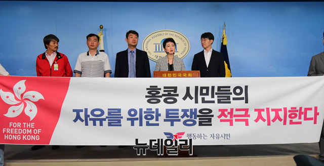 이언주 의원과 행동하는 자유시민이 18일 오전 서울 여의도 국회 정론관에서 홍콩민주화운동 지지 관련 기자회견을 하고 있다.