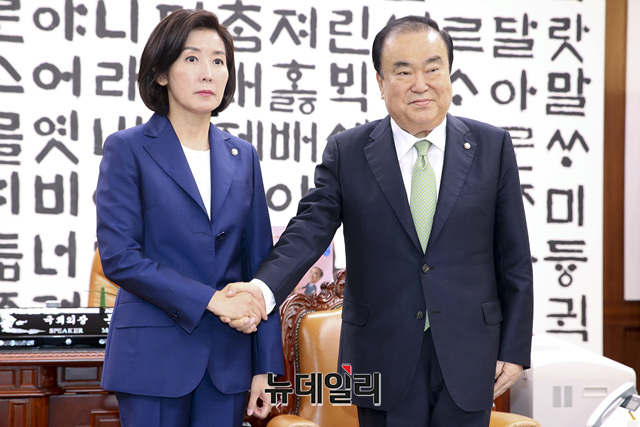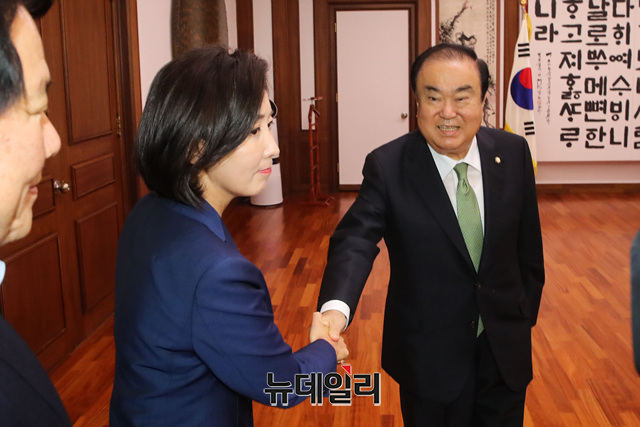 문희상 국회의장과 여야 4당 교섭단체 원내대표들이 18일 오후 국회 의장 집무실에서 회동이 예정된 가운데 문 의장과 자유한국당 나경원 원내대표가 만나 악수를 하고 있다.