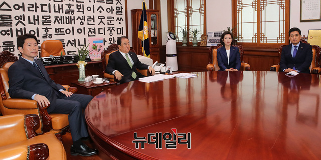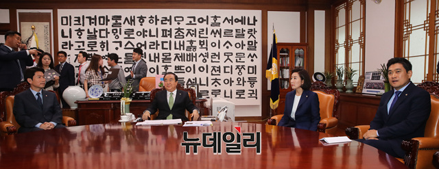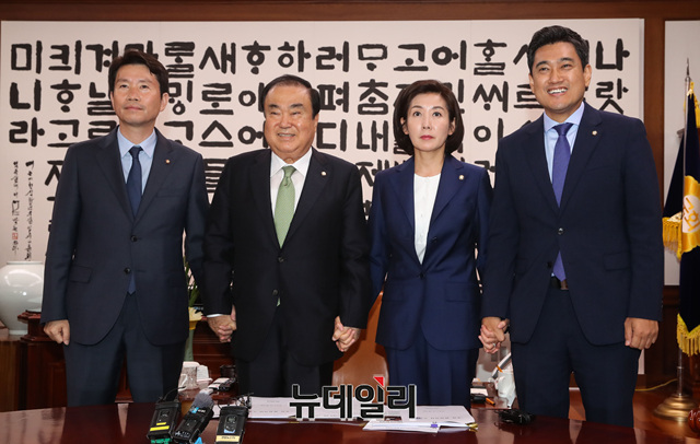 문희상 국회의장과 여야 4당 교섭단체 원내대표들이 18일 오후 국회 의장 집무실에서 회동을 갖기에 앞서 기념사진을 촬영하고 있다. (왼쪽부터 이인영 더불어민주당, 문 의장, 나경원 자유한국당, 오신환 바른미래당)