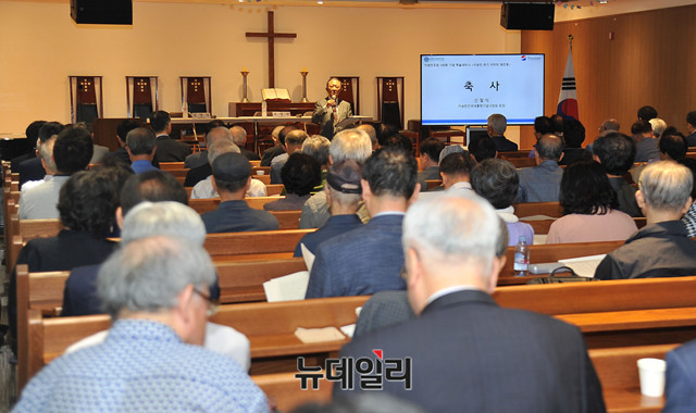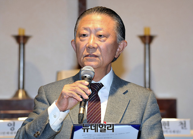 신철식 이승만건국대통령기념사업회 회장이 18일 오후 서울 중구 정동제일교회에서 열린 이승만포럼 100회 기념 학술세미나에 참석해 축사를 하고 있다.이날 세미나는 '이승만 초기 저작의 재조명'이라는 주제로 김명섭 연세대학교 정치외교학과 교수가 사회를 맡았다. 발표 및 토론자로 오영섭 연세대 이승만연구원 연구교수, 정인섭 서울대 법학전문대학원 교수, 허경진 연세대 객원교수, 김현철 동북아역사재단 연구위원, 최연식 연세대학교 교수, 김학은 연세대학교 명예교수 등이 나섰다.