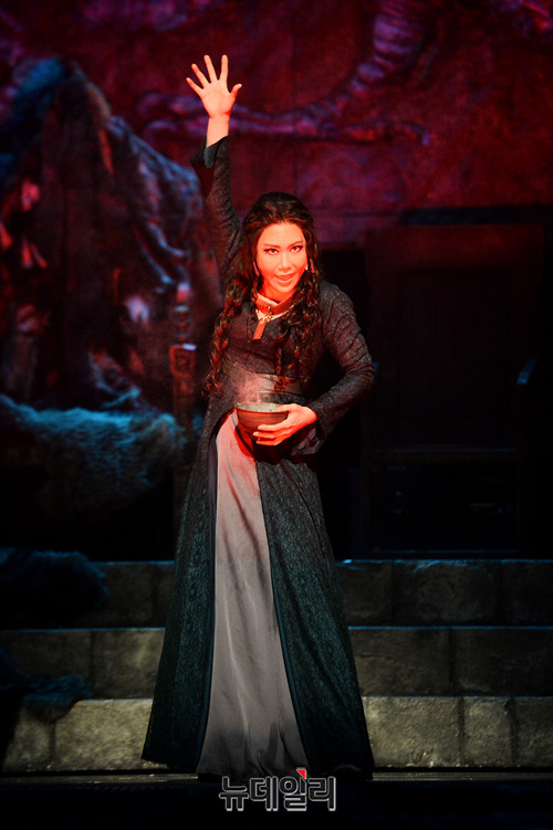 뮤지컬배우 신영숙이 18일 오후 서울 종로구 세종문화회관에서 열린 뮤지컬 '엑스칼리버' 프레스콜에서 무대 시연을 하고 있다.