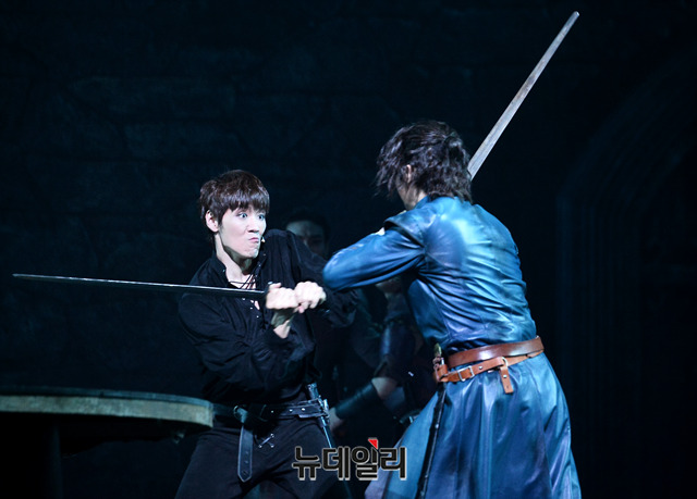 뮤지컬배우 카이와 박강현이 18일 오후 서울 종로구 세종문화회관에서 열린 뮤지컬 '엑스칼리버' 프레스콜에서 무대 시연을 하고 있다.