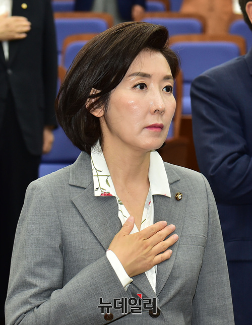 [포토] 국민의례하는 나경원 자유한국당 원내대표