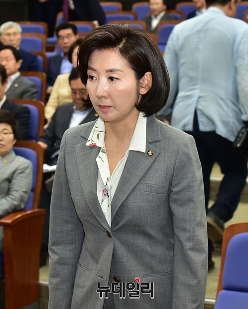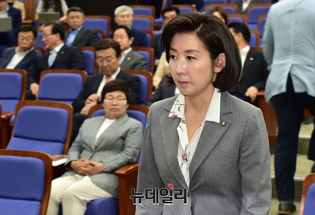 나경원 자유한국당 원내대표가 19일 오전 국회에서 열린 정책의원총회에서 모두발언을 위해 단상으로 향하고 있다.