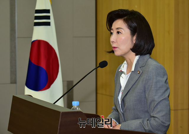 나경원 자유한국당 원내대표가 19일 오전 국회 의원회관에서 열린 '문재인 정권의 역사전쟁, 김원봉은 왜 현충일 추념사에 등장했나' 토론회에서 축사를 하고 있다.