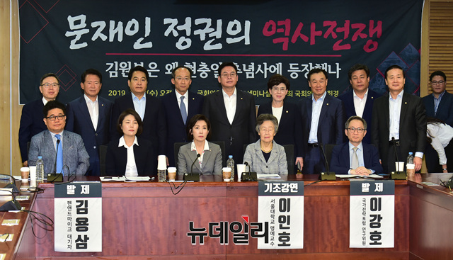 나경원 자유한국당 원내대표, 전희경 의원, 이인호 서울대 명예교수 등 참석자들이 19일 오전 국회 의원회관에서 열린 '문재인 정권의 역사전쟁, 김원봉은 왜 현충일 추념사에 등장했나' 토론회에서 기념촬영을 하고 있다.