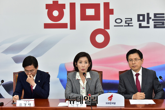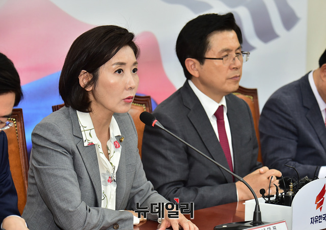 나경원 자유한국당 원내대표가 19일 오후 국회에서 열린 당대표 및 최고위원-중진의원 연석회의에서 모두발언을 하고 있다.