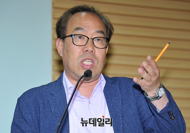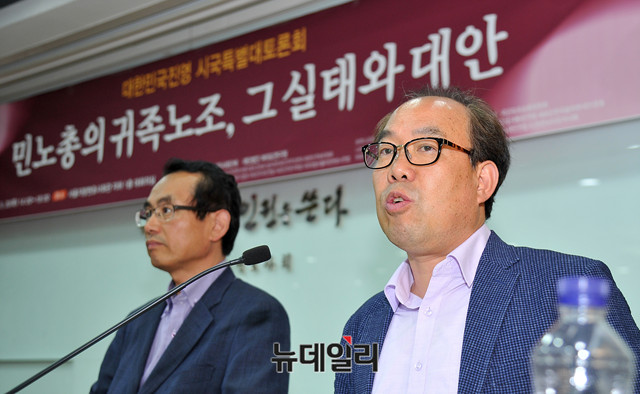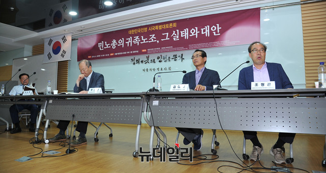 조형곤 대한민국수호비상국민회의 집행위원이 20일 오후 서울 서초구 서울지방변호사회에서 열린 '민노총의 귀족노조, 그 실태와 대안' 토론회에 참석해 '민노총의 귀족노조는 노동자의 대변인이 아니다'를 주제로 발표하고 있다.대한민국진영 시민사회단체와 재단법인 여의도연구원이 공동주최한 이번 행사에는 박관용 대한민국수호비상국민회의 상임대표, 장기표 신문명정책연구원장, 주대환 플랫폼자유와공화 공동의장, 김세연 여의도연구원장, 박인환 바른사회시민회의 공동대표 등이 참석했다.